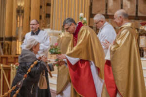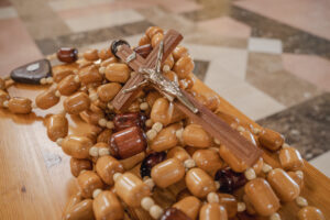 Wśród darów ołtarza szczególną uwagę zwracała kompozycja róż – dwóch czerwonych i dziesięciu białych – symbolizujących miłość i czystość modlitwy różańcowej. Obok nich złożono także duży, drewniany różaniec, wewnątrz którego umieszczono dary ofiarne. W chwili przeistoczenia stały się one Ciałem i Krwią naszego Pana Jezusa Chrystusa. Ta piękna symbolika poruszyła serca wiernych i przypomniała, że różaniec jest nie tylko modlitwą słów, ale także darem serca składanym Bogu przez ręce Maryi.