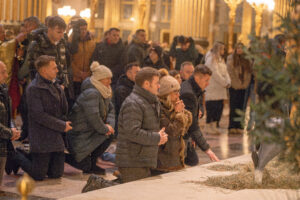 Wyjątkowym i najbardziej wzruszającym momentem liturgii był gest przekazania figury Dzieciątka Jezus wiernym. Pielgrzymi, stojący w nawie głównej świątyni, z rąk do rąk podawali sobie figurę Nowonarodzonego, aż ostatecznie spoczęła ona w przygotowanym żłóbku. Ten symboliczny akt ukazał prawdę o Bogu, który rodzi się dla każdego bez wyjątku. Przekazywanie figury uświadomiło zgromadzonym, że Emmanuel powierza się w ludzkie ręce, pragnąc być obecnym w konkretnej codzienności każdego człowieka.