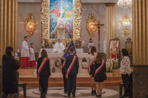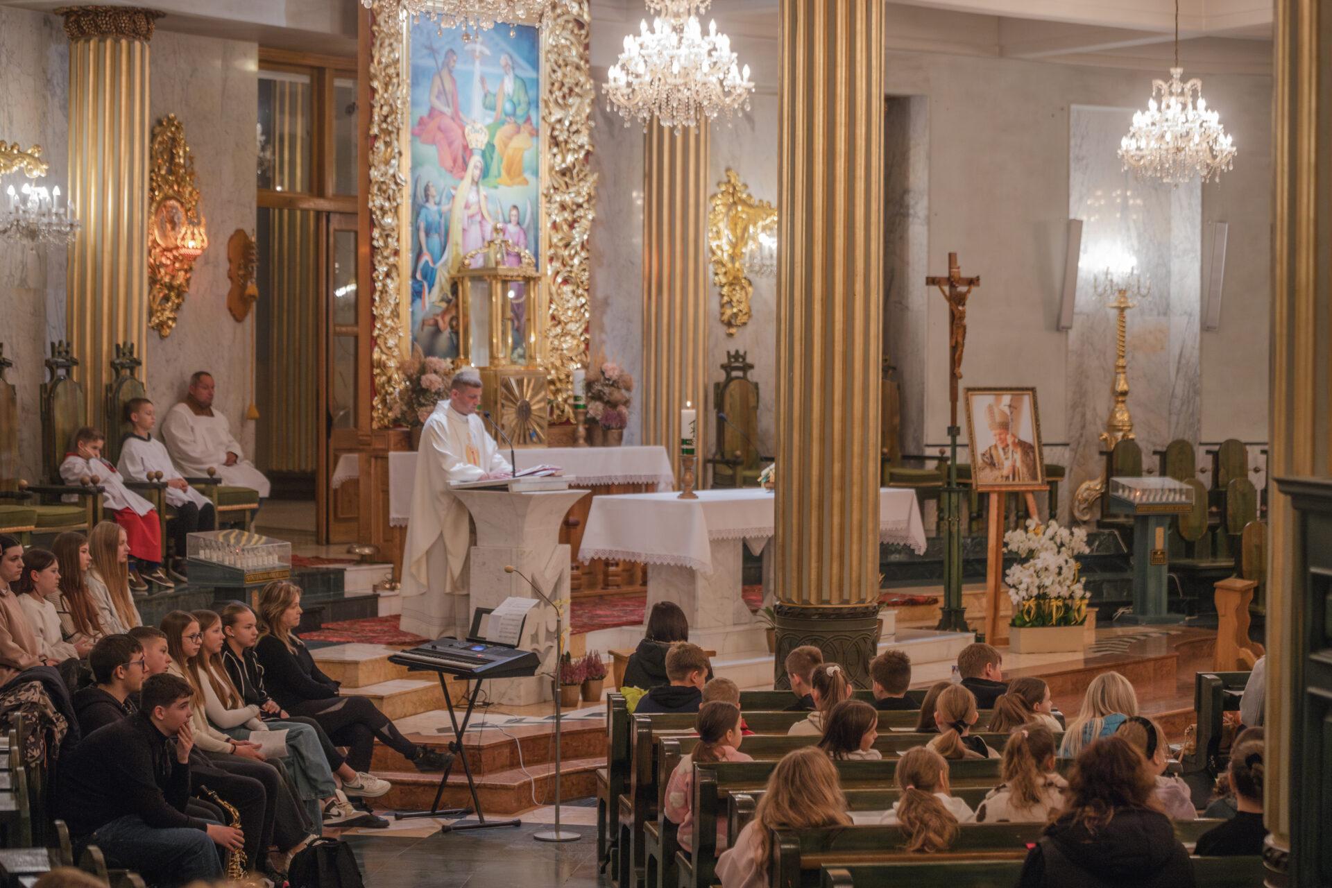 180 pątników przywitał kustosz sanktuarium Sławomir Homoncik MIC, a Mszy św. przewodniczył wikariusz parafii Kramsk Robert Gumosiński. Ten dzień był również szczególnym dla 16 uczniów klas pierwszych, którzy złożyli ślubowanie. Jednogłośnie mówiąc: „Ślubujemy”, przypieczętowali swoje zobowiązania.