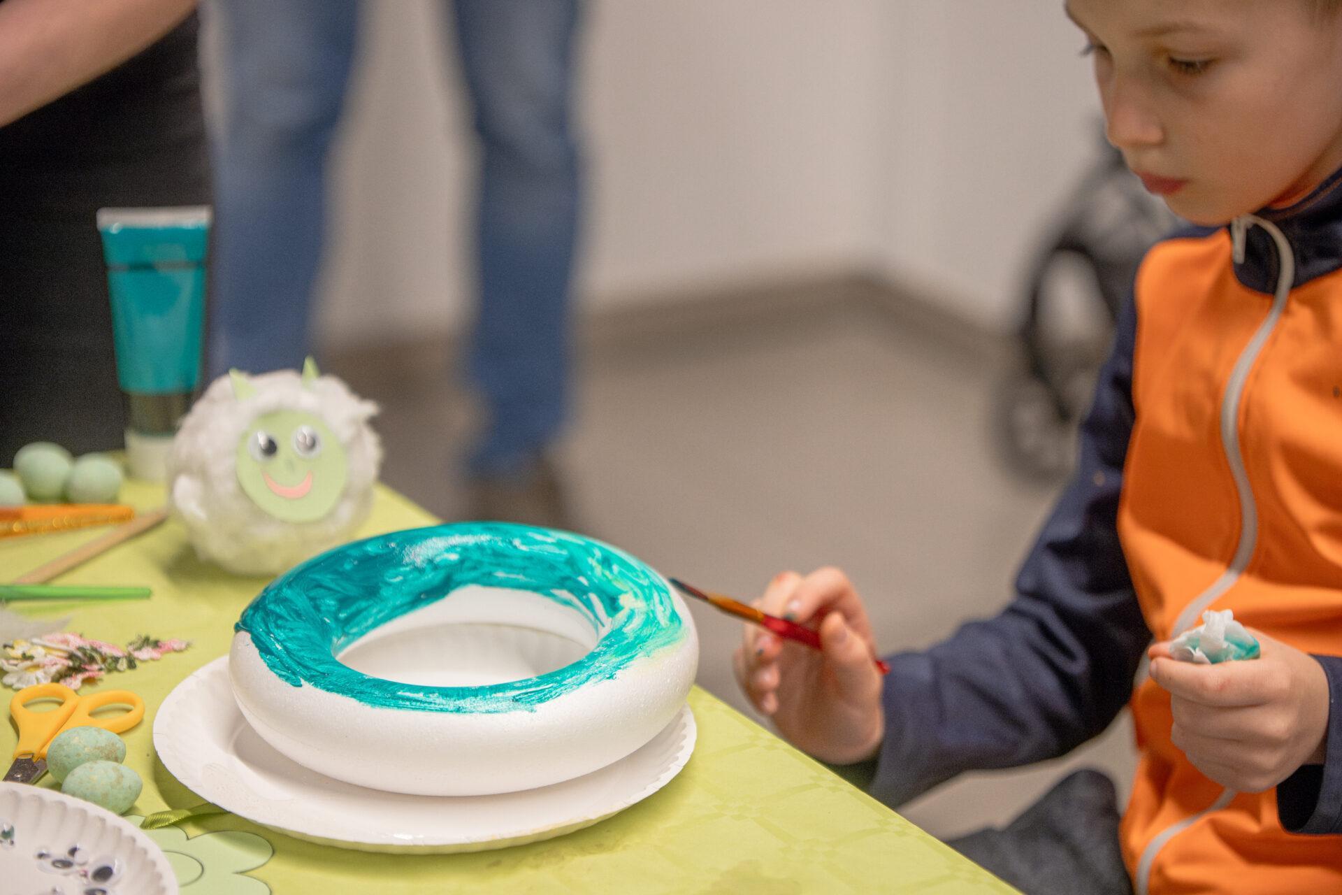 Kolejnym punktem programu były zajęcia plastyczne, które spotkały się z ogromnym entuzjazmem uczestników. Dzieci z zaangażowaniem i radością tworzyły własnoręczne ozdoby wielkanocne- baranki, kolorowe pisanki oraz wiosenne wianki. W powietrzu unosiła się twórcza atmosfera 😊