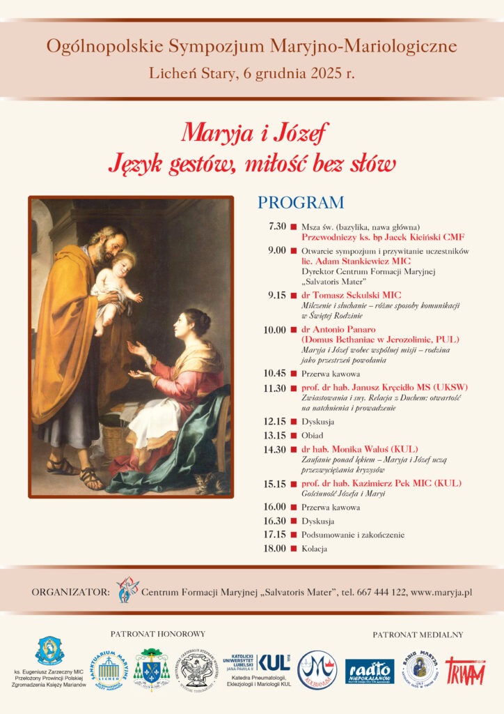 Centrum Formacji Maryjnej z siedzibą w sanktuarium Matki Bożej Licheńskiej serdecznie zaprasza do wzięcia udziału w Sympozjum Maryjno-Mariologicznym „Maryja i Józef. Język gestów, miłość bez słów”, które odbędzie się 6 grudnia 2025 r. w Domu Pielgrzyma „ARKA” w Licheniu Starym.