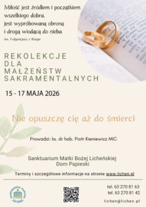 15Mai(15 mai)18:0017(maj 17)13:00Rekolekcje dla małżeństw sakramentalnych "Nigdy Cię nie opuszczę"
