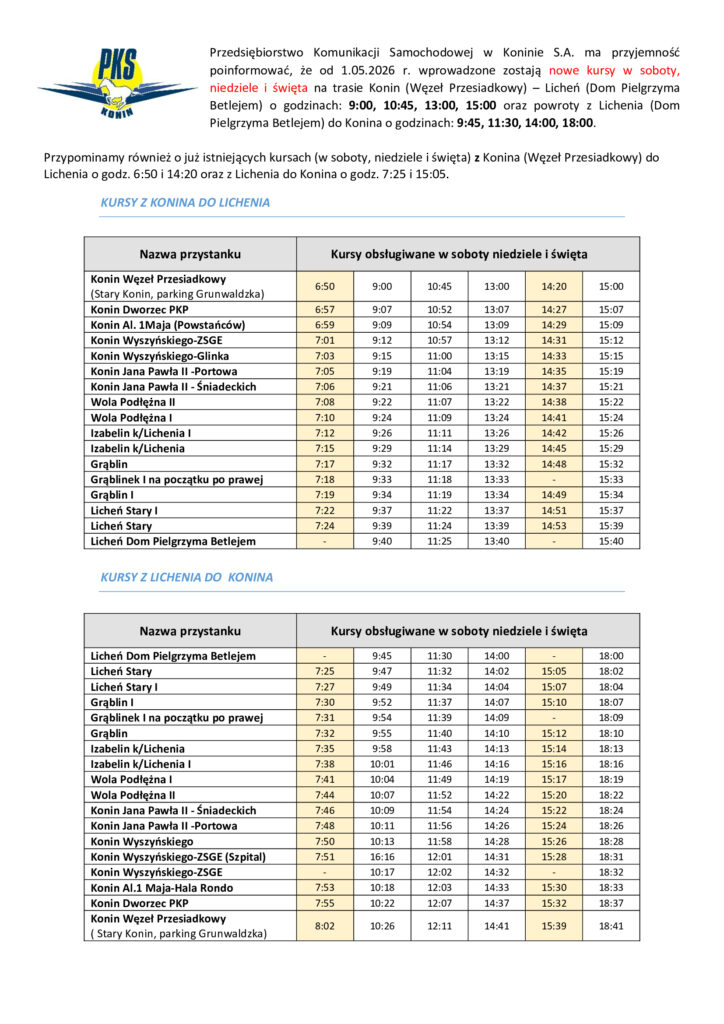 Dużymi krokami zbliża się nowy sezon pielgrzymkowy, który w sanktuarium rozpocznie się 1 maja. W tym dniu autobus MZK linii nr 67 przestanie kursować do Lichenia. Jednak pielgrzymi nadal będą mieli możliwość dojazdu do sanktuarium. Od tej daty w soboty, niedziele oraz w święta, które są dniami ustawowo wolnymi od pracy, do sanktuarium będzie można dojechać z Konina autobusami Państwowej Komunikacji Samochodowej (PKS). Autokary będą kursować według nowego rozkładu: od przystanku Konin (Węzeł Przesiadkowy, ul. Grunwaldzka) do Lichenia (Dom Pielgrzyma Betlejem) i z powrotem. Co ważne, zwłaszcza dla mieszkańców Izabelina i Grąblina, autobusy będą się zatrzymywać na całej trasie na wszystkich przystankach, na których zwyczajowo zatrzymują się autobusy PKS. Oprócz dodatkowych kursów, w wyżej wymienione dni, będą realizowane już istniejące połączenia.