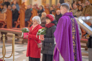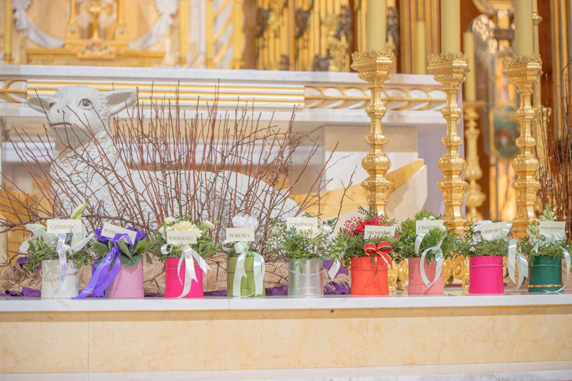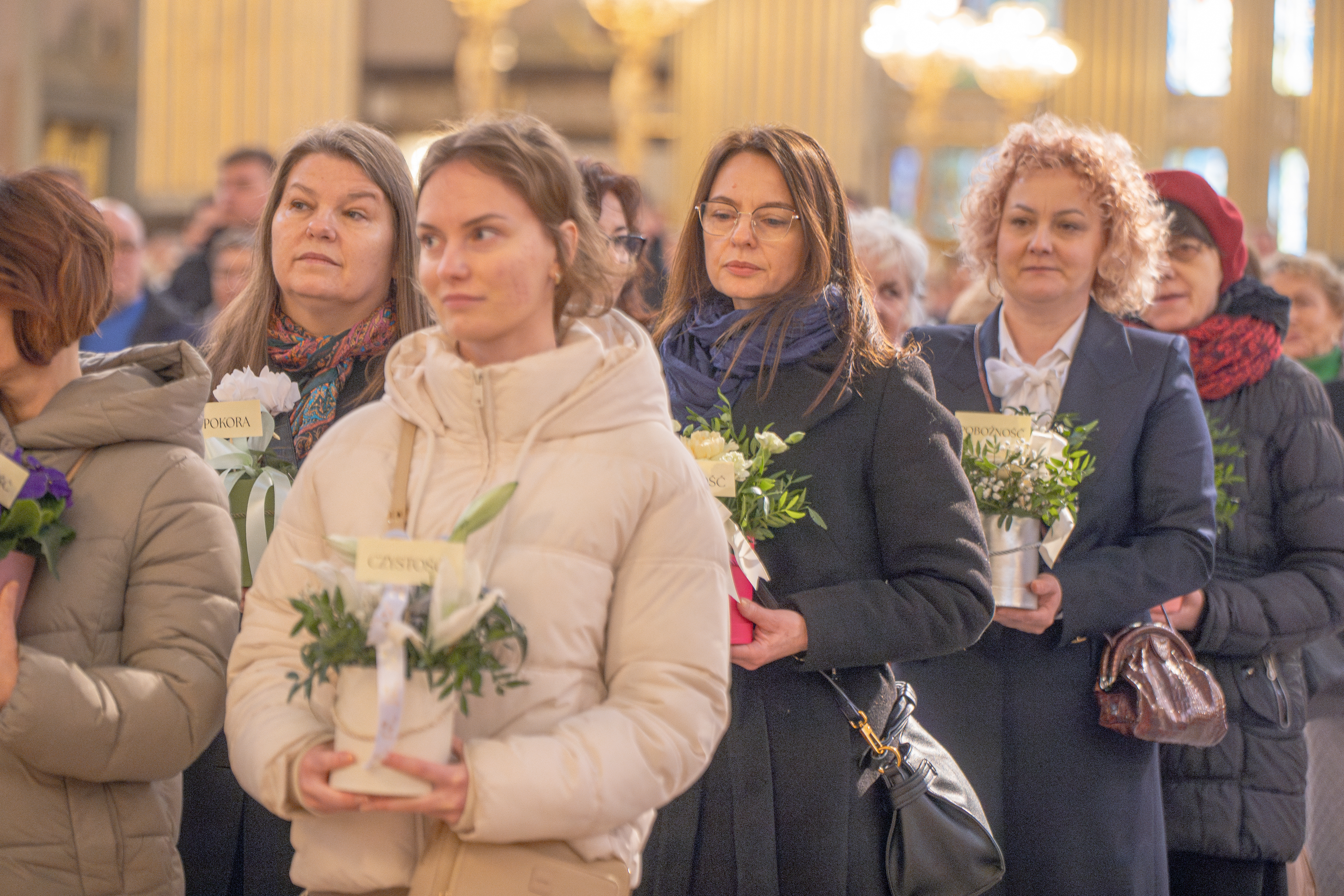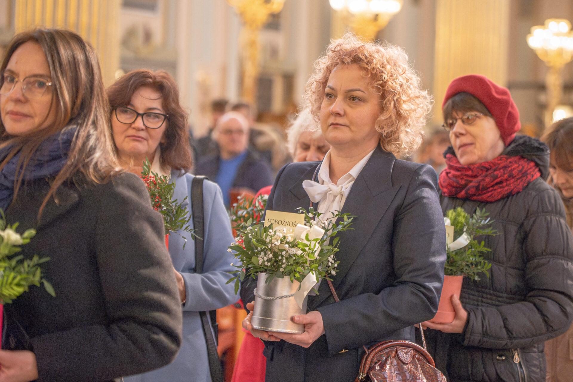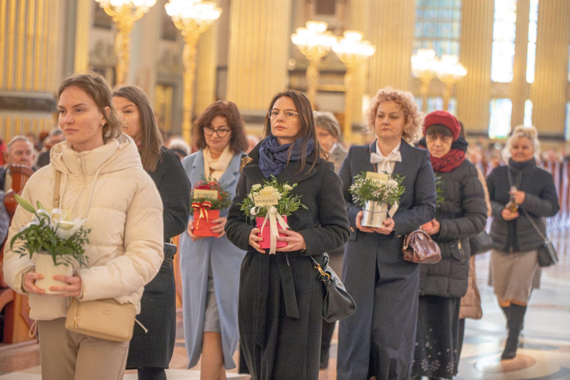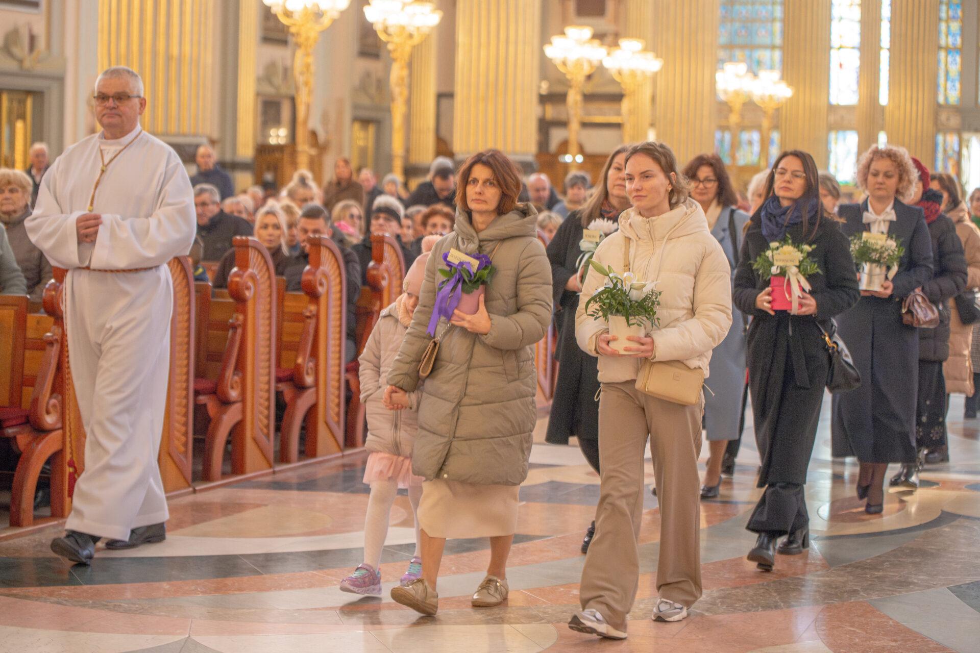Podczas liturgii wymownym momentem była procesja z darami. Kobiety, w różnym wieku i różnego stanu, przyniosły do ołtarza bukiety kwiatów symbolizujące dziesięć cnót Najświętszej Maryi Panny: czystość, roztropność, pokorę, wierność,pobożność, posłuszeństwo, ubóstwo, cierpliwość, miłosierdzie oraz boleść. Niesione przez kobiety lilie, róże, goździki, fiołki stały się wyrazem wdzięczności i jednocześnie przypomnieniem o duchowych wartościach, które Maryja ukazuje każdej kobiecie nie tylko do podziwiania, lecz do naśladowania i pielęgnowania w sobie.