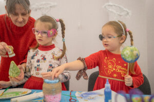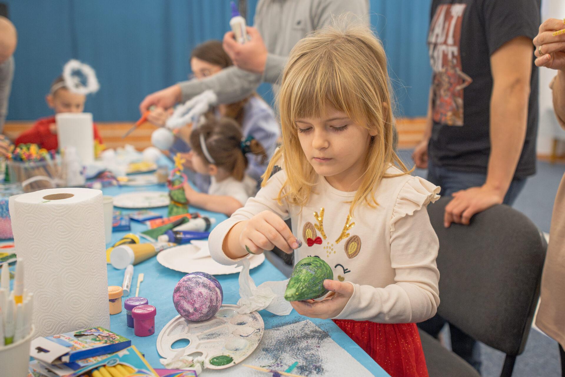 Po chwili skupienia przyszedł czas na zabawę ruchową, która pozwoliła dzieciom rozładować energię i jeszcze bardziej zintegrować się ze sobą. Kolejnym punktem programu była część manualna. Dzieci z dużym zaangażowaniem własnoręcznie ozdabiały choinki, bombki oraz gwiazdki, rozwijając swoją kreatywność i ciesząc się wspólnym tworzeniem w świątecznej atmosferze.